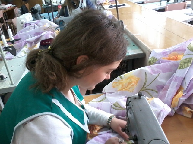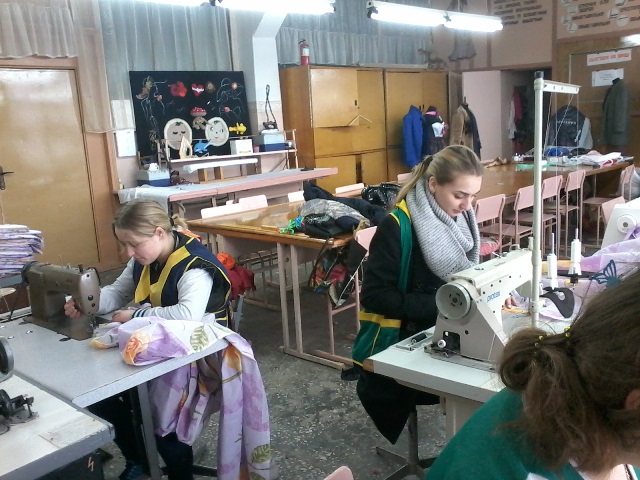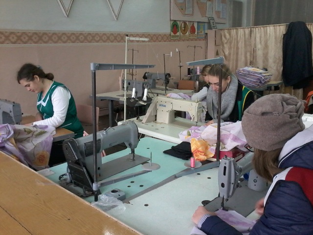 Учні професії «Кравець» на уроках виробничого навчання шиють постільну білизну для літніх людей Хмельницького геріатричного пансіонату для ветеранів війни і праці (будинок-інтернат для пристарілих).,