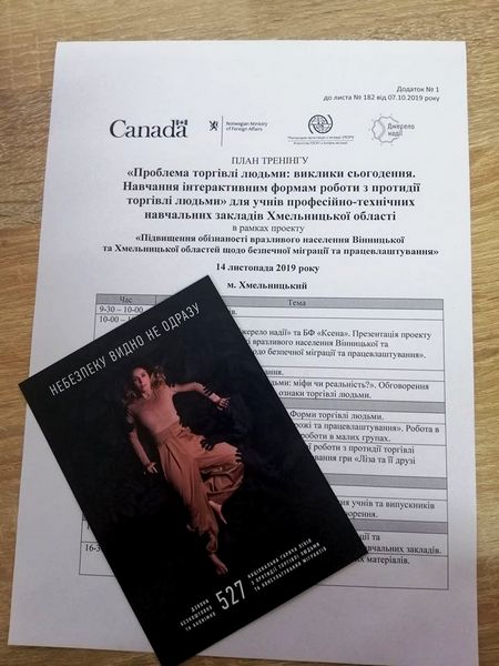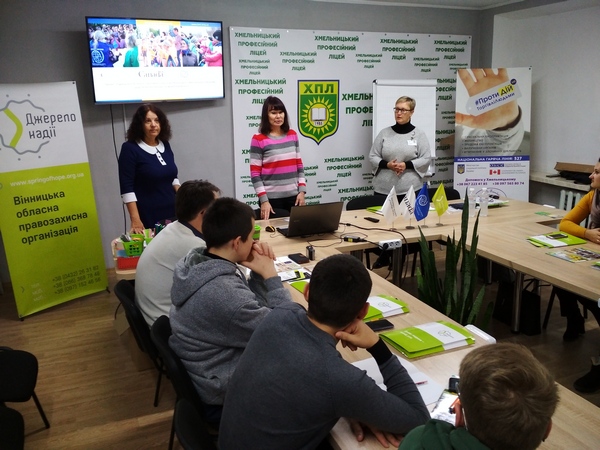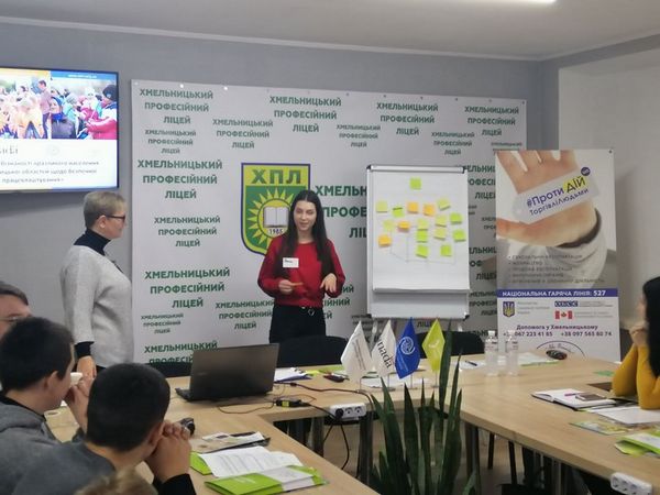 В рамках проекту "Підвищення обізнаності вразливого населення Вінницької та Хмельницької областей щодо безпечної міграції та працевлаштування" 14 листопада 2019 року на базі Хмельницького професійного ліцею було проведено тренінг для тренерів "Проблема торгівлі людьми: виклики сьогодення. Навчання інтерактивним формам роботи з протидії торгівлі людьми" для учнів професійно-технічних навчальних закладів Хмельницької області".