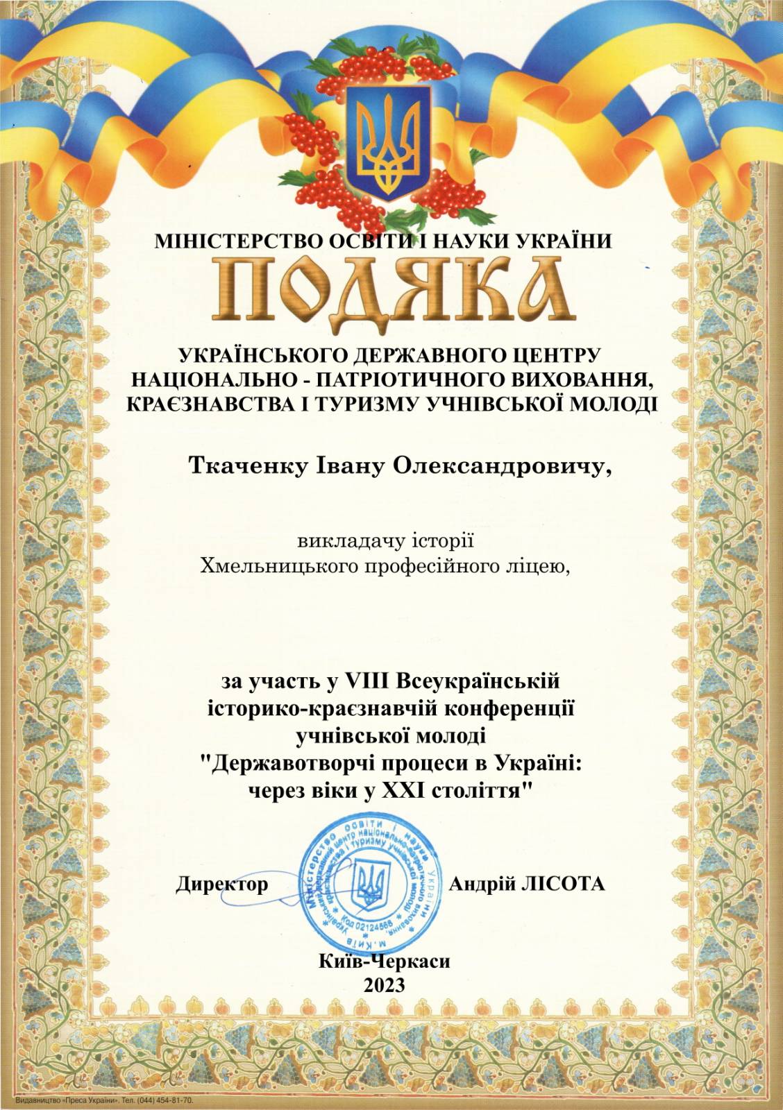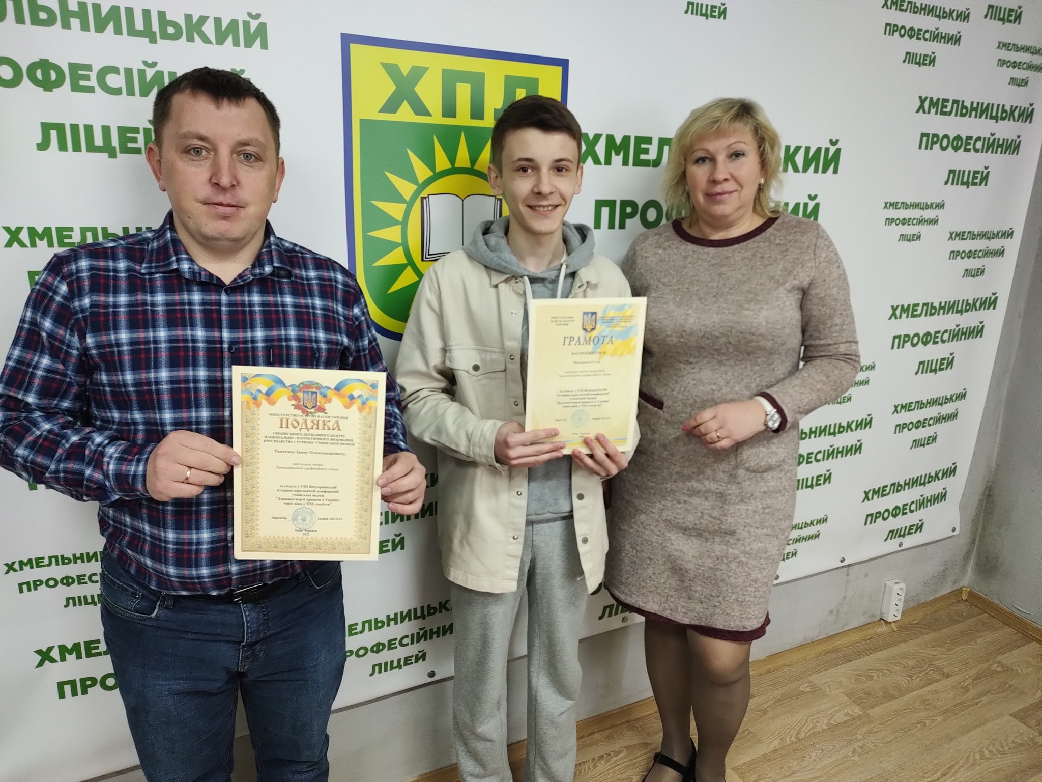 Здобувачі освіти Хмельницького професійного ліцею завжди вирізняються активною громадянською позицією, реагують на події, які відбуваються в Україні. За участь у конференції здобувач освіти Мазуренко Єгор нагороджений грамотою Українського державного центру національно-патріотичного виховання, краєзнавства і туризму учнівської молоді.