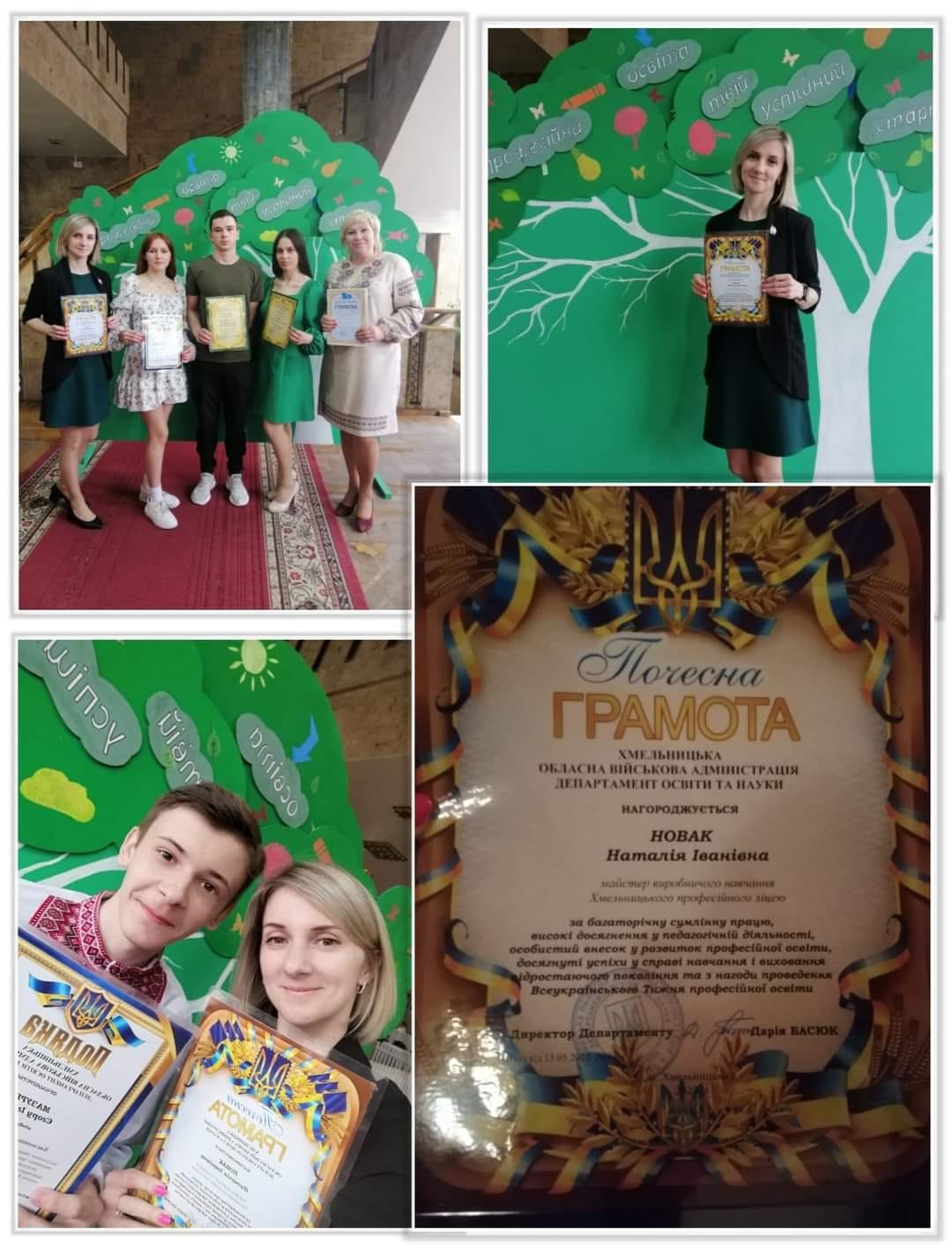 День 5 Гала-концерт учасників освітнього процесу ЗП(ПТ)О в рамках Тижня професійної освіти!!! Колектив Хмельницького професійного ліцею нагороджений Подякою, Здобувачі освіти ліцею нагороджені Дипломами за перемогу в конкурсах професійної майстерності: професія"Зварник" Нідзельський Павло І місце; професія "Швачка" Собчук Альона ІІІ місце, нагороджені Почесними грамотами Департаменту освіти та науки Хмельницької ОДА здобувачі освіти: Весна Мирослава, Єгор Мазуренко, педагогічні працівники: Новак Наталія Іванівна, Гжегожевський Богдан Євгенович.