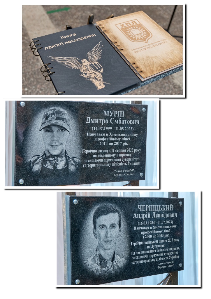 Сьогодні, напередодні свята Дня захисника і захисниць України та свята Покрови пресвятої Богородиці, Дня Українського козацтва та Дня УПА, які вперше у цьому році відзначаються 1-го жовтня, через реформу церковного календаря в Україні, в Хмельницькому професійному ліцеї відкрили пам'ятні дошки випускникам ліцею Андрію ЧЕРНІЦЬКОМУ та Дмитру МУРІНУ, пам'ятні знаки, які будуть нагадувати нам про війну, про Героїв України, про материнське, людське горе...На церемонії відкриття були присутні рідні загиблих бійців, представники влади Михайло Кривак, духовний наставник ліцею Леонід Дяченко, працівники та учнів ліцею.